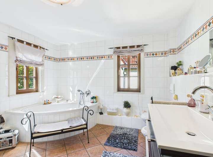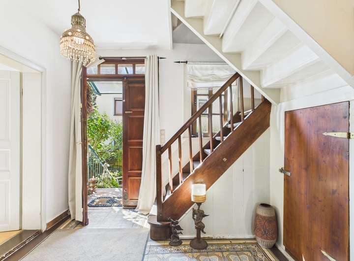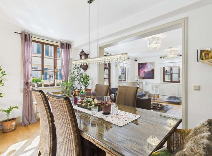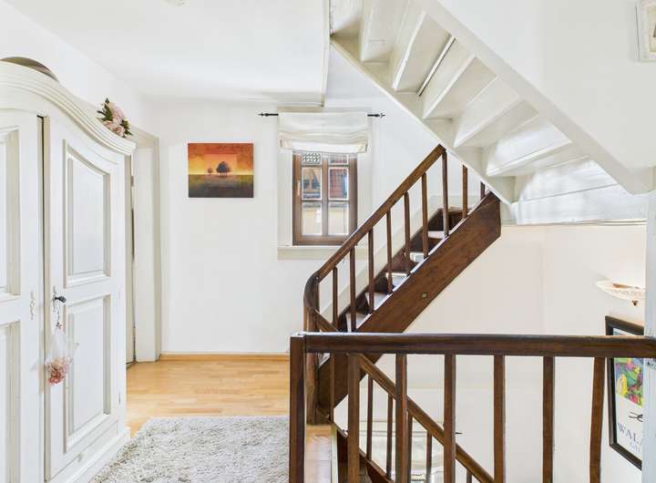 Im Inneren erwarten Sie Großzügigkeit und überraschende Alternativen zum Gewohnten. Beim Betreten des Hauses spürt man sofort den historischen Charme, der von den liebevoll erhaltenen Elementen, wie der alten Treppe und den teilweise alten Türen ausgeht. Außergewöhnliche Raumhöhen und gemütliche Ecken machen den Charme dieser Immobilie aus. Für Behaglichkeit und ein idyllisches Ambiente sorgen unter anderem die teilweise sichtbaren Holzbalken. Alles in allem handelt es sich bei diesem charmanten Objekt um eine Immobilie der Marke "direkt einziehen“. Hochwertige Bodenbeläge aus Parkett und Fliesen unterstreichen das gepflegte Ambiente. Mit einer großzügigen Wohnfläche von insgesamt ca. 225 m² und 7,5 Zimmern bietet diese Immobilie vielseitige Nutzungsmöglichkeiten für Familien, Paare oder Personen, die einen Raum für ein Homeoffice benötigen.