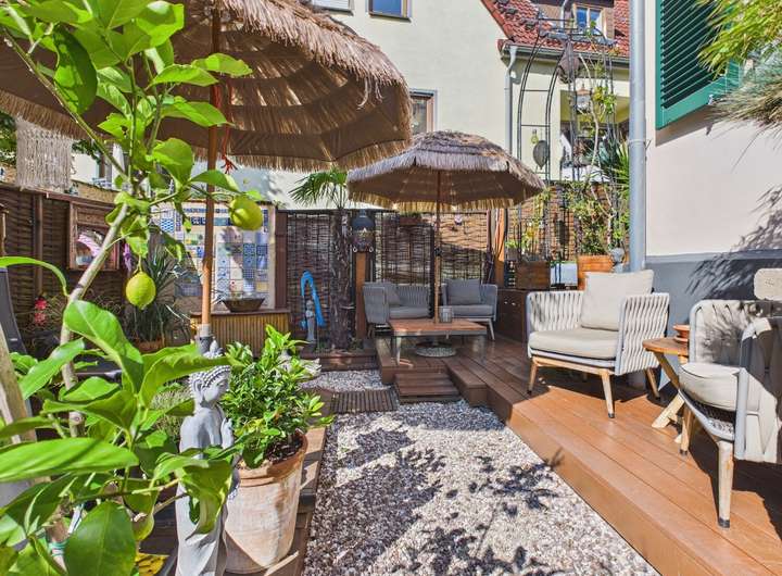 - pflegeleichtes Grundstück mit Lounge-Bereich und Holzterrasse