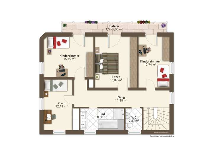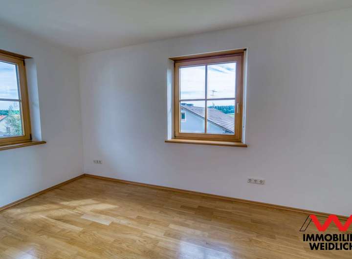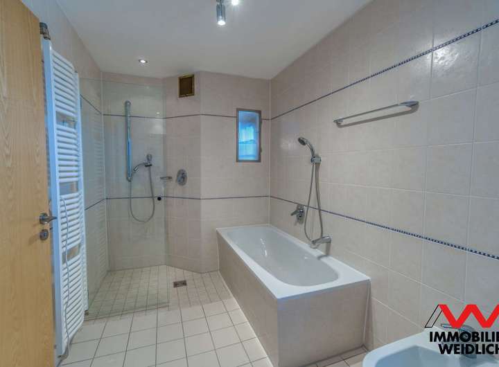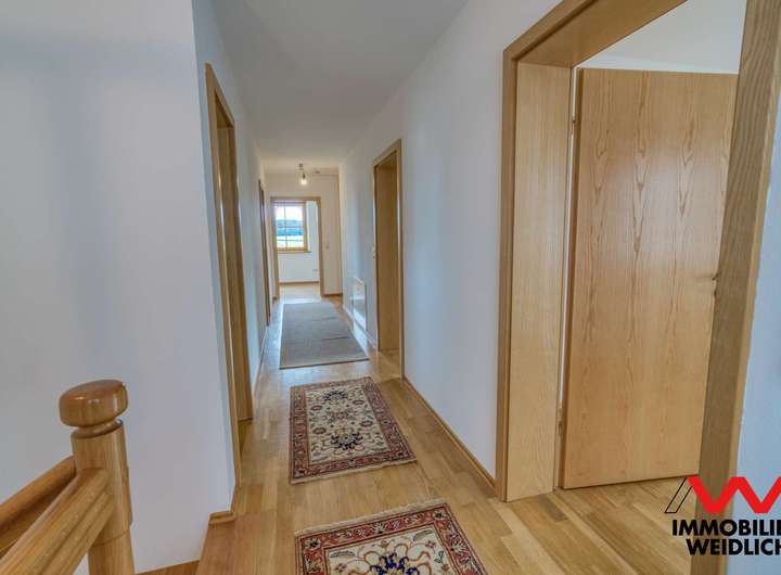 Das Obergeschoss überzeugt mit vier Schlafzimmern, die sich ideal als Elternschlafzimmer, Kinderzimmer oder Gäste-Arbeitszimmer nutzen lassen. Ergänzt wird die Etage durch ein Badezimmer mit Badewanne und bodengleicher Dusche, ein separates WC sowie einen Balkon mit Blick ins Grüne.