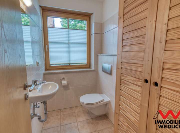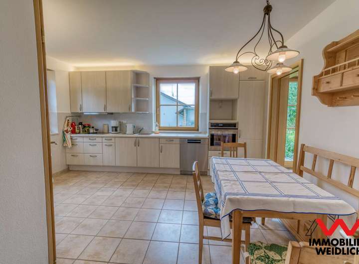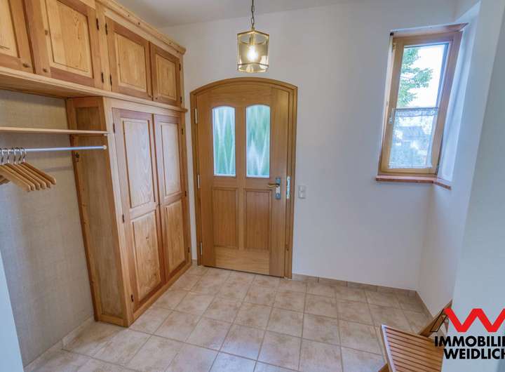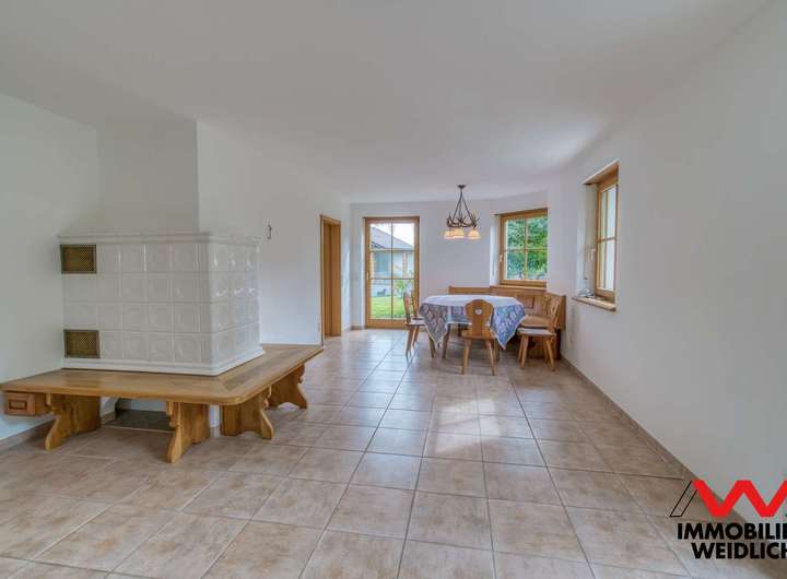Im Erdgeschoss empfängt Sie eine helle Diele mit Garderobe, von der aus Sie in den großzügigen Wohn- und Essbereich gelangen. Hier sorgt ein Kachelofen für gemütliche Abende, während die großen Fensterflächen den Blick in den Garten freigeben. Die separate Küche verfügt über einen zusätzlichen Essplatz und eine angrenzende Speisekammer. Vom Wohnraum aus haben Sie Zugang zur sonnigen Terrasse, die viel Raum zum Entspannen oder geselligen Beisammensein bietet.