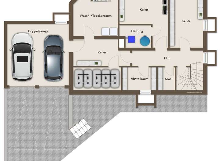 Im Untergeschoss stehen mehrere Kellerräume, ein Wasch- und Trockenraum sowie ein Abstellraum zur Verfügung. Von hier aus erreichen Sie direkt die Doppelgarage mit elektrischem Tor.