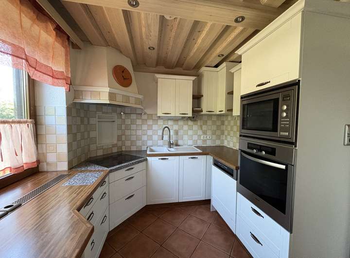 Das Haus verfügt im Erdgeschoss über drei geräumige Zimmer und ein modernes Badezimmer, die einen komfortablen Wohnstil ermöglichen. Eine geschmackvolle Einbauküche mit hochwertigen Markengeräten ist im Kaufpreis enthalten. Besonders hervorzuheben ist der lichtdurchflutete Wintergarten mit herrlicher Südausrichtung, der das ganze Jahr über zum Entspannen einlädt. Ein traditioneller Kachelofen mit neuem Heizeinsatz aus dem Jahr 2022 sorgt im Wohnzimmer für eine gemütliche Atmosphäre in den kühleren Monaten.
