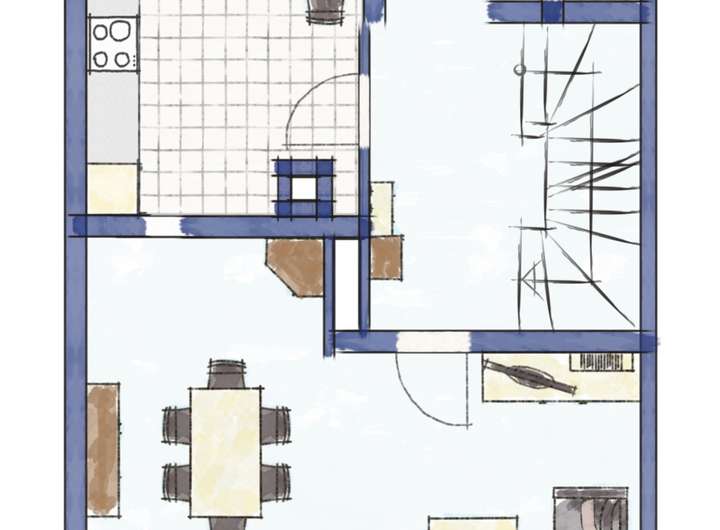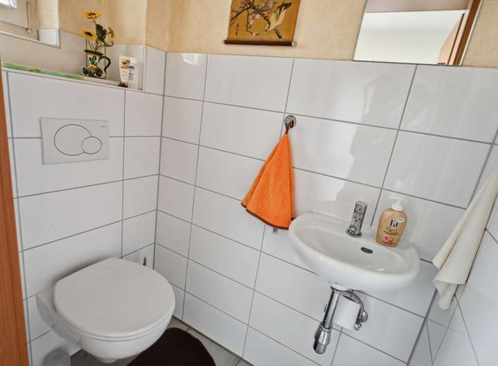 Im Erdgeschoss erwarten Sie ein einladender Flur, ein Gäste-WC, das vor etwa zehn Jahren modernisiert wurde, eine Küche sowie ein heller Wohn- und Essbereich. Von hier aus gelangen Sie direkt auf die Terrasse und in den gepflegten Garten, der Raum für Erholung und individuelle Gestaltung bietet.