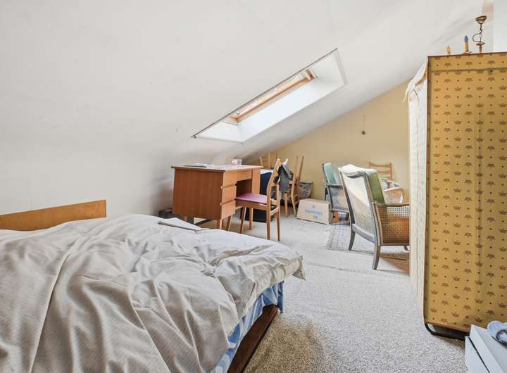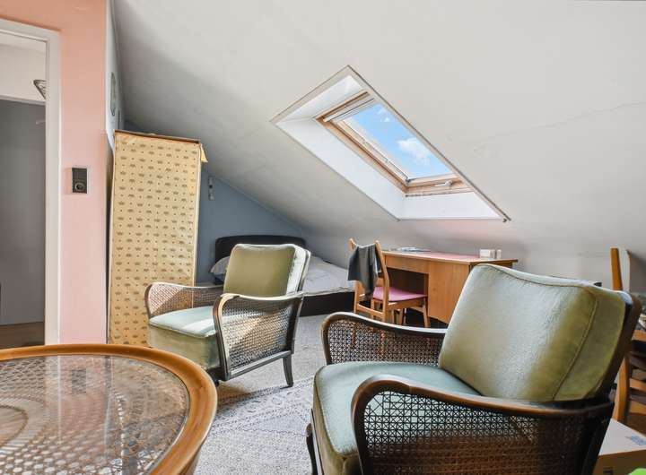 Das Obergeschoss umfasst drei gut geschnittene Schlafzimmer, von denen eines Zugang zu einem kleinen Balkon bietet. Ein Tageslichtbadezimmer rundet das Raumangebot dieser Etage ab. Im Dachgeschoss stehen ein Speicher sowie ein zusätzliches Schlafzimmer mit VELUX-Fenster zur Verfügung – ideal als Gästezimmer, Arbeitsbereich oder Rückzugsort.