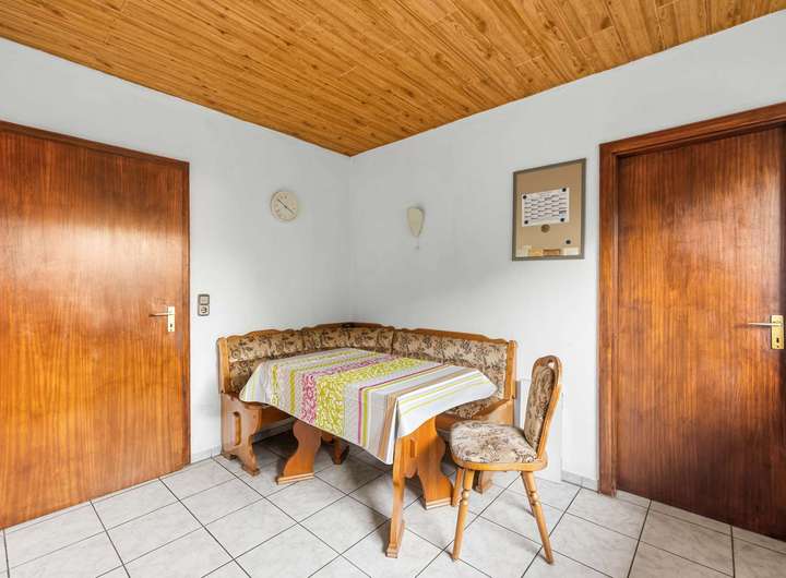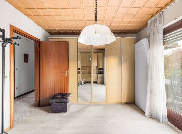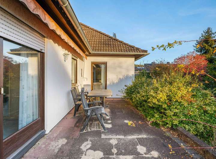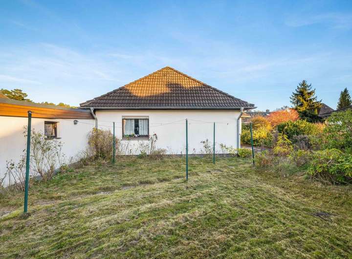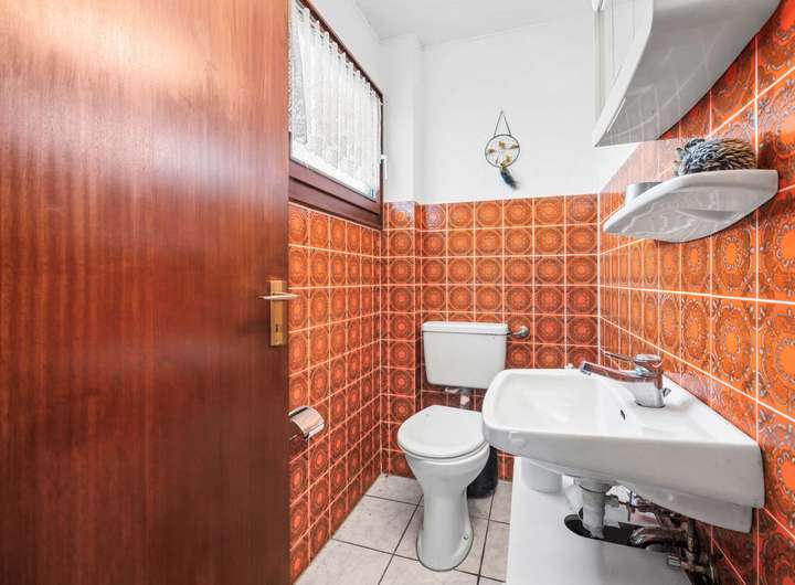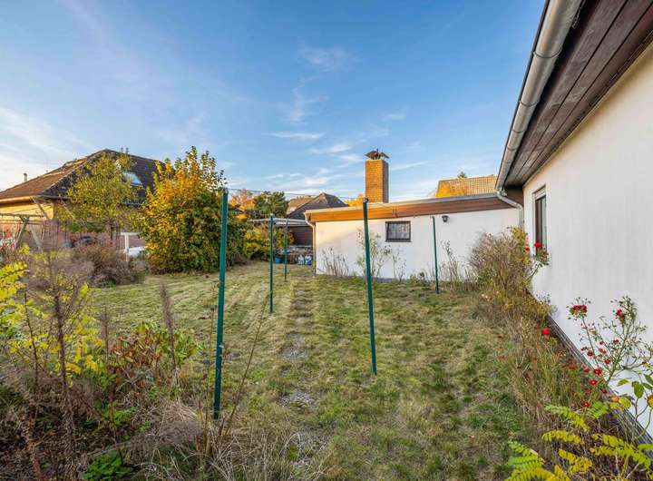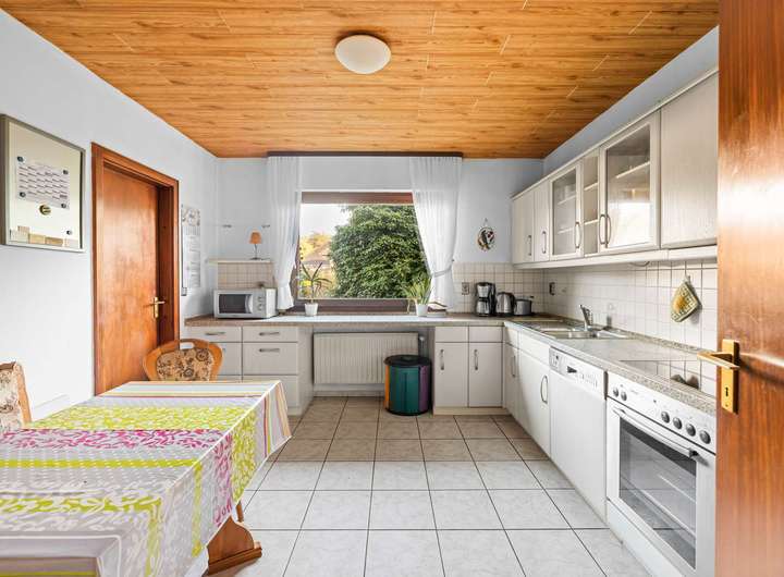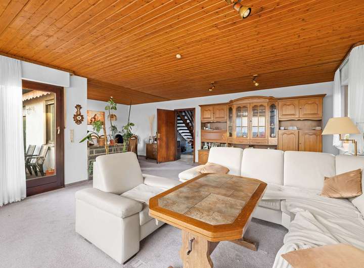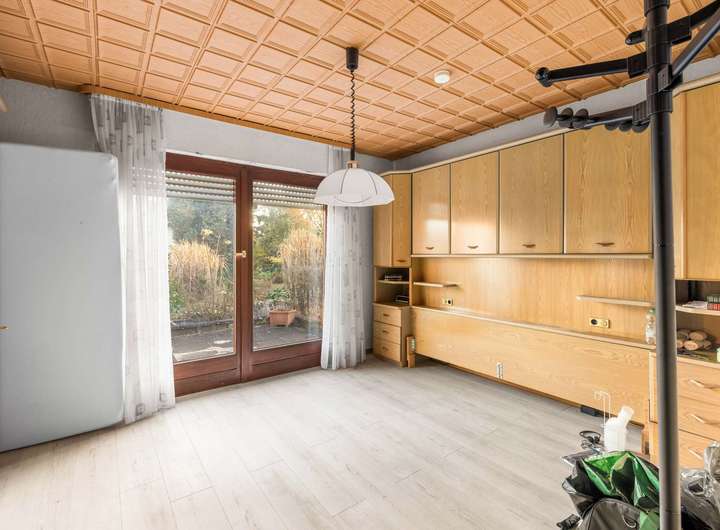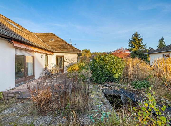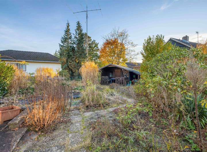 Innen erwartet Dich ein Grundriss, der einlädt, neu gedacht zu werden: Im Erdgeschoss befinden sich ein Gäste-WC, die Küche mit kleinem Vorratsraum und ein heller Wohn- und Essbereich mit direktem Zugang zur Terrasse. Sie ist offen gestaltet und lässt sich durch die Markise flexibel beschatten – perfekt für gemütliche Sommerabende. Der Garten bietet mit seinem Gartenhäuschen, der schützenden Hecke und dem kleinen Teich, der wieder zum Leben erweckt werden möchte, viel Platz für Deine Ideen und zukünftige Lieblingsplätze.