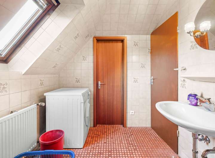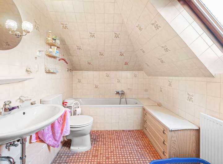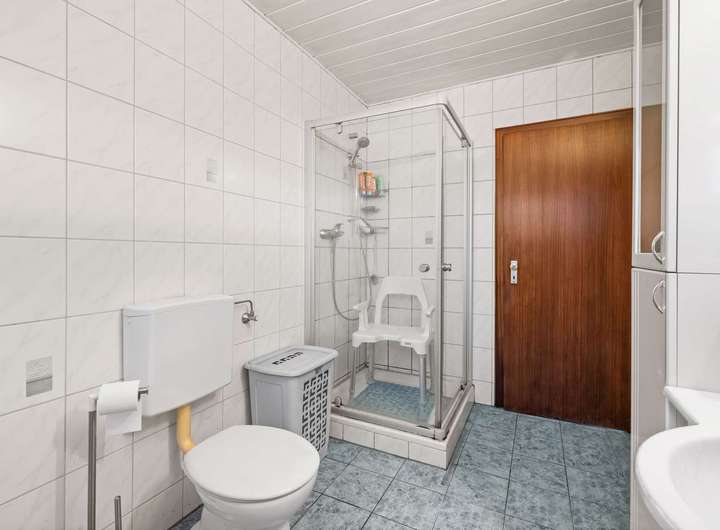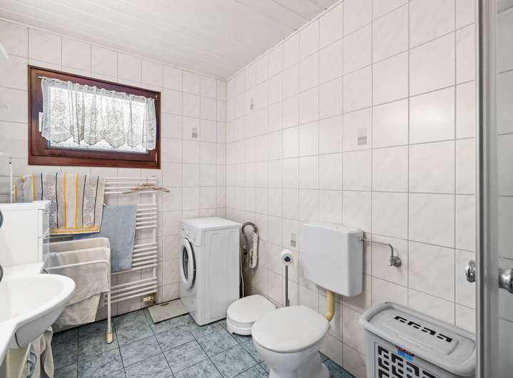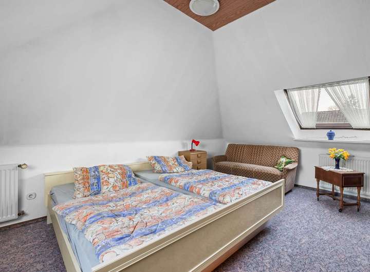 Zwei Zimmer sowie ein Badezimmer mit Dusche ergänzen das Erdgeschoss. Über eine offene, leicht geschwungene Treppe erreichst Du das Obergeschoss mit zwei weiteren Räumen und einem Badezimmer mit Badewanne – ideal für Schlaf-, Arbeits- oder Kinderzimmer. Der Dachboden hält zusätzliche Abstellfläche bereit und bietet sogar Ausbaupotenzial für noch mehr Raum.