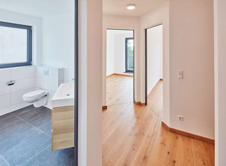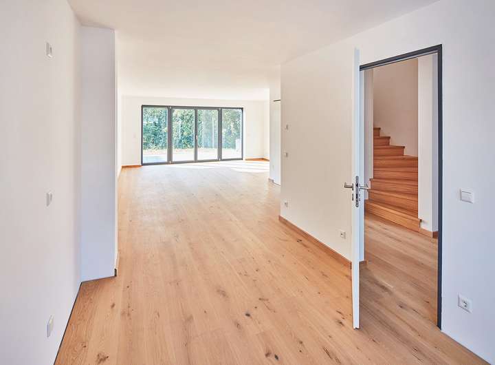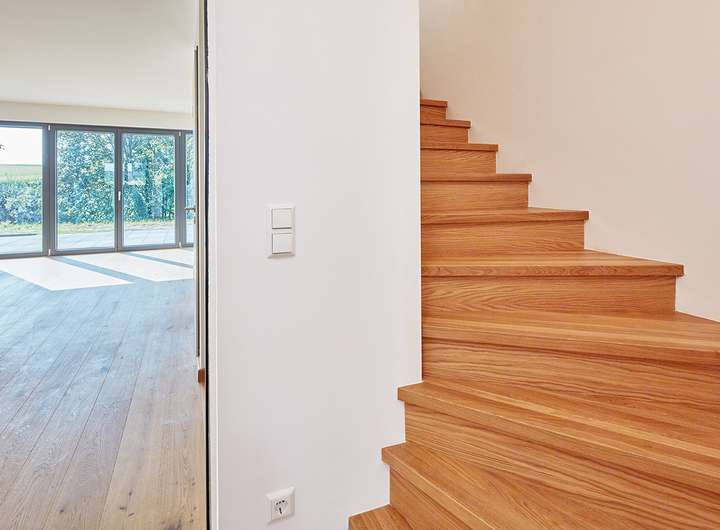 Bis auf das moderne Gäste-WC mit Fenster im Eingangsbereich sowie das Badezimmer im ersten Obergeschoss sind die Wohnebenen mit einem Echtholzboden ausgelegt, der beim Betreten des Hauses für eine Wohlfühlatmosphäre sorgt. Auch die Treppenhäuser sind von Keller bis zum Dachgeschoss mit Holzstufen gestaltet, sodass sich das Bild einheitlich durch das gesamte Haus fortsetzt.