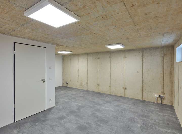 Das Kellergeschoss ist mit anthrazitfarbenen Fliesen ausgelegt. In einem der beiden Kellerräume befindet sich die Haustechnik samt der Pelletheizung sowie der Waschmaschinenanschlüsse. Zusätzlich bringt dieser sowie der zweite Kellerraum viel Stauraum mit sich.