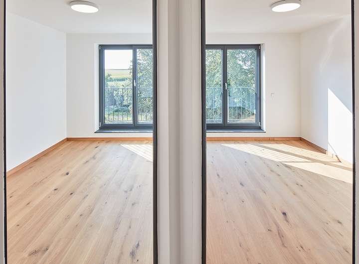 Im ersten Obergeschoss befindet sich zur Hausvorderseite ein großes Schlafzimmer, mittig das moderne Badezimmer mit Badewanne und Dusche sowie zwei weitere Zimmer mit ca. 10 m² Fläche. Durch die nahezu bodentiefen Fenster genießt man den Blick ins Grüne, hinweg über Wiesen und Felder.