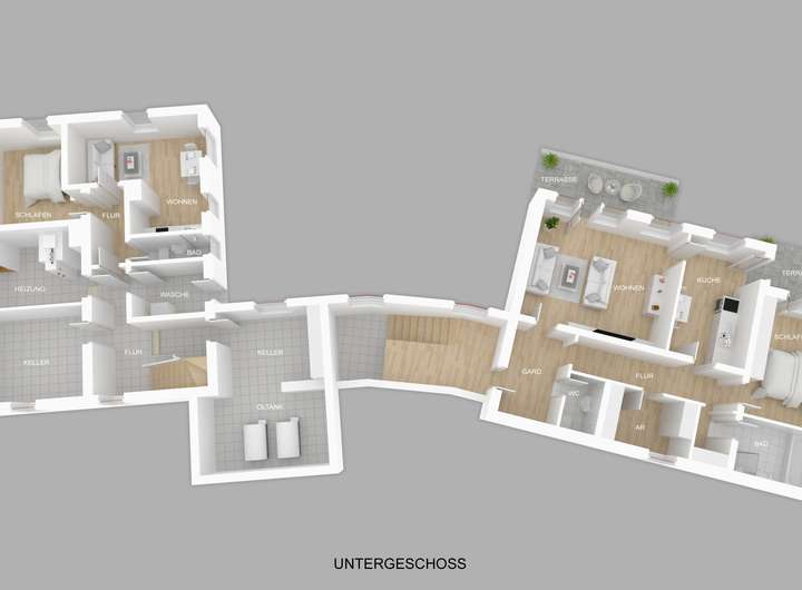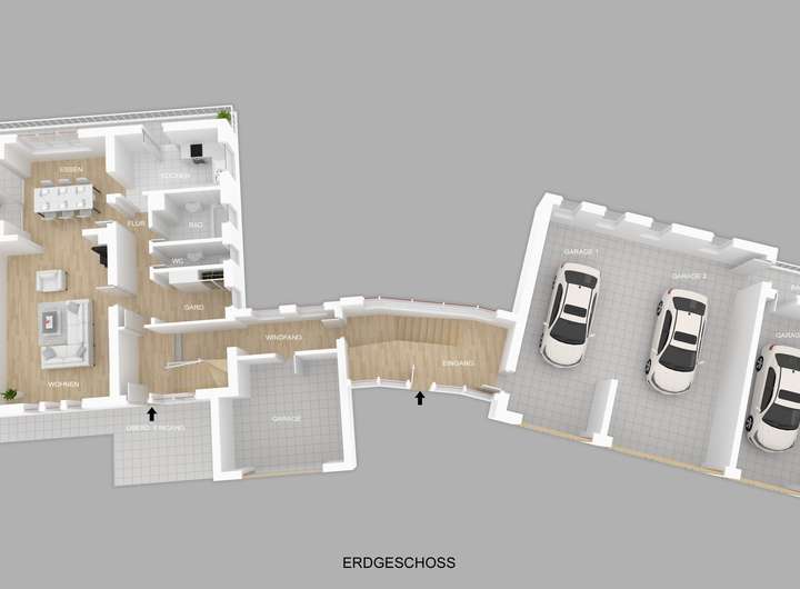 Die Wohnfläche von insgesamt ca. 280,11m² verteilt sich auf ca. 198,36m² für das Wohnhaus und auf ca. 81,75m² für die 3-Zimmer-Wohnung. Aufgrund leichter Hanglage gliedert sich die Immobilie in Obergeschoss, Erdgeschoss und Untergeschoss.