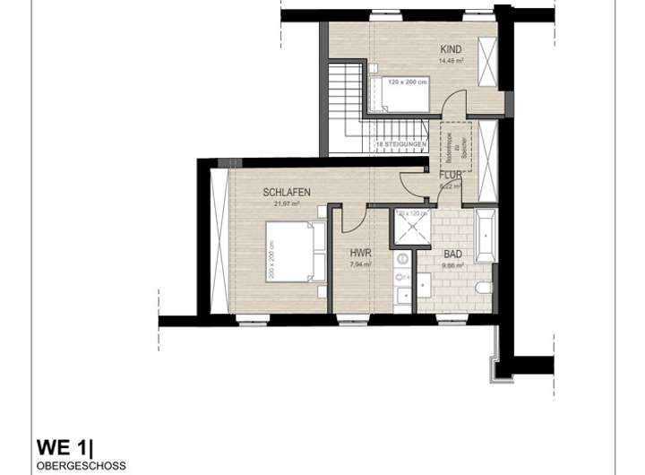 Das rund 60 qm große OG umfasst 2 Schlafräume, ein Ankleidezimmer und ein großes modernes Badezimmer mit Fenster.