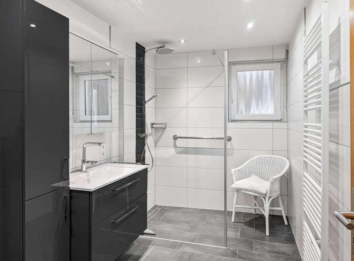 - modernes Tageslichtbadezimmer mit ebenerdiger Dusche und Bodenheizung