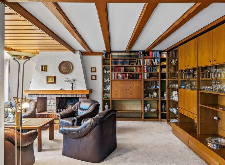 - lichtdurchflutetes, großes Wohnzimmer mit offenem, gemauerten Kaminofen und Sichtbalkendecke