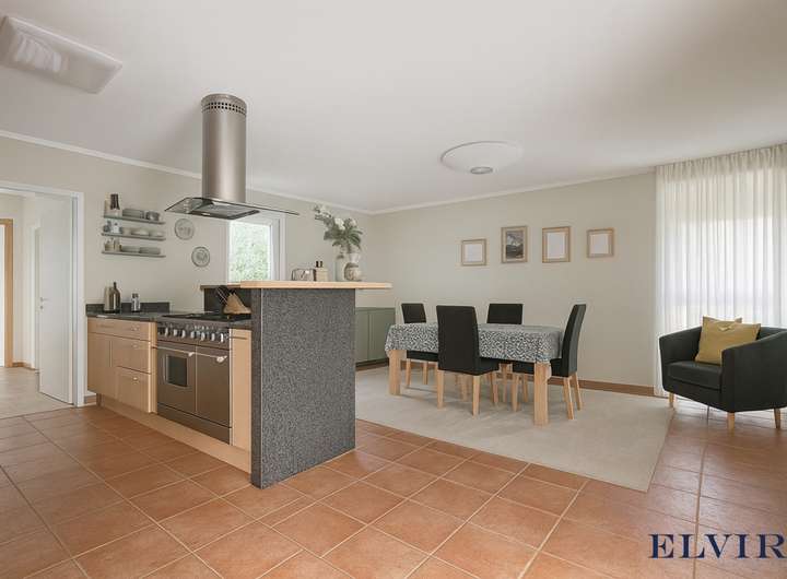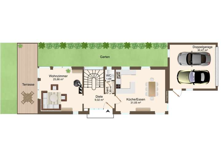 Großer und heller Eingangsbereich. Im Erdgeschoss des Hauses erwartet Sie ein großzügiges Wohnzimmer und eine große, offene Küche mit angrenzendem Essbereich. Ergänzt wird das Erdgeschoss durch ein WC.