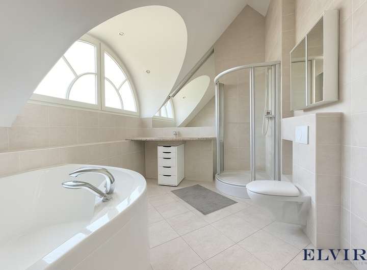 Das obere Geschoss beeindruckt mit zwei geräumigen, lichtdurchfluteten Schlafzimmern und einem wirklich großen Badezimmer, welches eine Oase der Ruhe bietet.