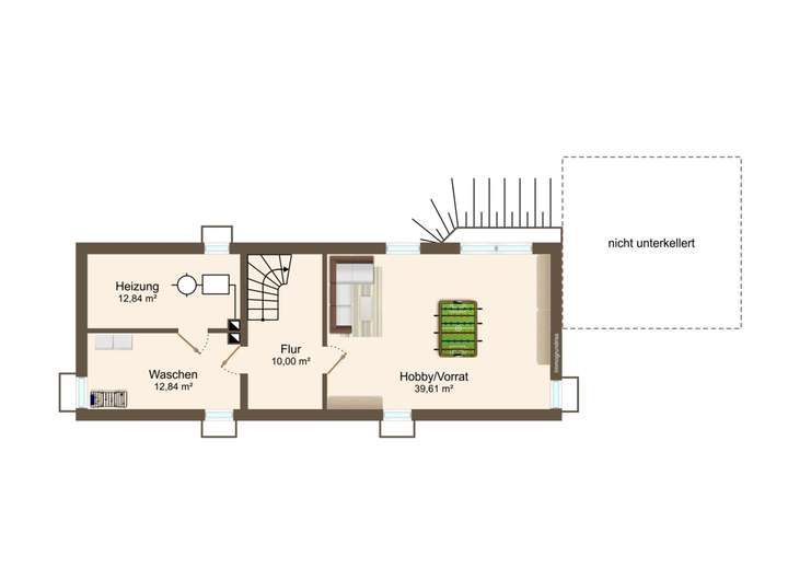 Das Untergeschoss bietet einen großzügigen Hobbyraum mit Fenstern, der vielfältige Nutzungsmöglichkeiten eröffnet. Des Weiteren finden Sie dort einen praktischen Heizungs- und Wäscheraum, der auch als zusätzlicher Stauraum genutzt werden kann.