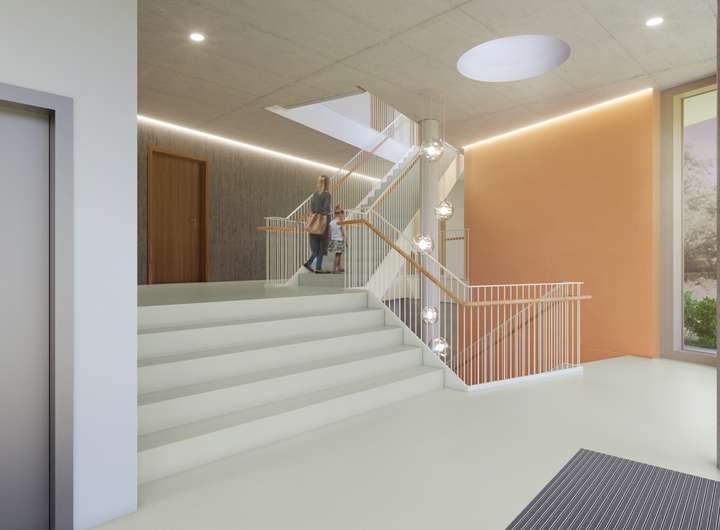 Das Quartier ist gedacht als ein Ort, an dem ältere Menschen, Alleinerziehende, junge Familien und Singles generationsübergreifend zusammenleben können. Großzügige Treppenhäuser dienen hier nicht nur der Erschließung, sondern auch als gemeinsamer Treffpunkt der Bewohner. So entsteht ein lebendiges, nachbarschaftliches Miteinander inmitten einer einzigartigen Parklandschaft.