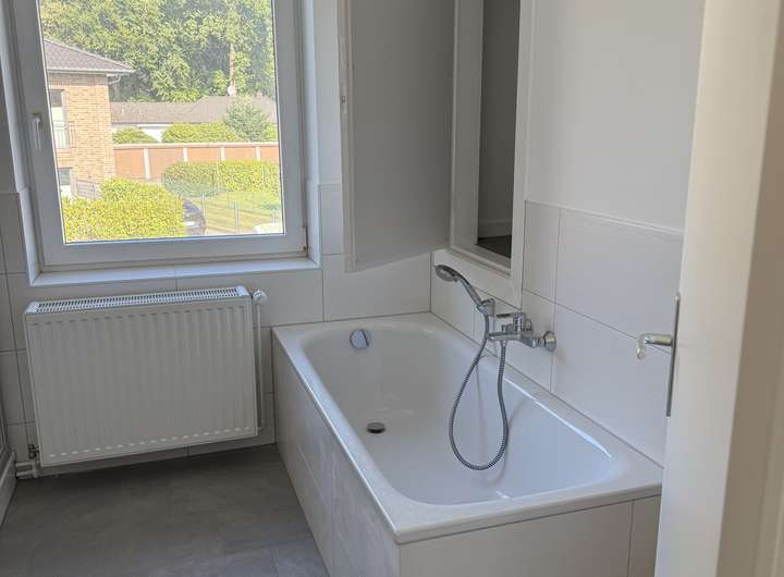 Im Bad ist sowohl eine Badewanne als auch eine Dusche und Fenster , Vollwaschmaschine