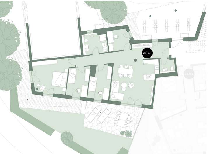 Das Quartier ist gedacht als ein Ort, an dem ältere Menschen, Alleinerziehende, junge Familien und Singles generationsübergreifend zusammenleben können. Großzügige Treppenhäuser dienen hier nicht nur der Erschließung, sondern auch als gemeinsamer Treffpunkt der Bewohner. So entsteht ein lebendiges, nachbarschaftliches Miteinander inmitten einer einzigartigen Parklandschaft.