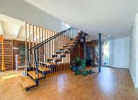 Vom Eingang gelangt man in einen großzügigen Wohn- und Essbereich, der als Herzstück des Hauses beeindruckt. Hier gehen Kaminbereich, Esszimmer und Wohnzimmer fließend ineinander über und schaffen einen offenen, einladenden Lebensraum. Hochwertiges Parkett, hell verputzte Wände und die markante Holztreppe als zentrales Gestaltungselement verleihen dem Haus ein einzigartiges Wohnambiente. Vom Wohn- und Essbereich führen bodentiefe Schiebetüren auf die überdachte Terrasse und in den Garten.