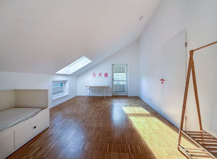 Das Obergeschoss überzeugt mit drei unterschiedlich großen Schlafzimmern die alle mit maßgeschneiderten Plissees ausgestattet sind und ein perfektes Zusammenspiel aus Licht, Privatsphäre und Wohnkomfort bieten. Zwei Bäder ergänzen die Etage: eines mit WC und Waschbecken, das andere hochwertig ausgestattet mit Dusche und Badewanne. Zusätzlicher Raum entsteht durch das Spitzdach, das als flexible Nutzfläche vielseitig genutzt werden kann.