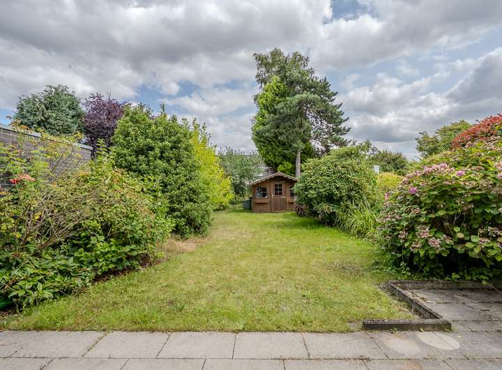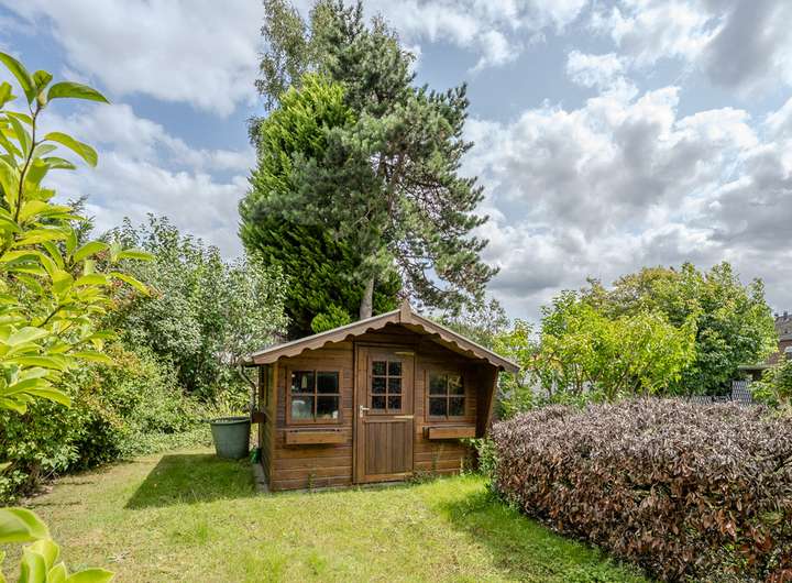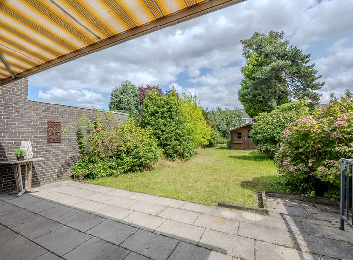 Der Garten selbst ist nicht nur großzügig, sondern auch besonders praktisch angelegt: Ein rückseitiger Zugang ermöglicht den bequemen Transport von Mülltonnen, Fahrrädern oder Gartengeräten, ohne das Haus betreten zu müssen. Dieser Komfort wird im Alltag schnell unverzichtbar.