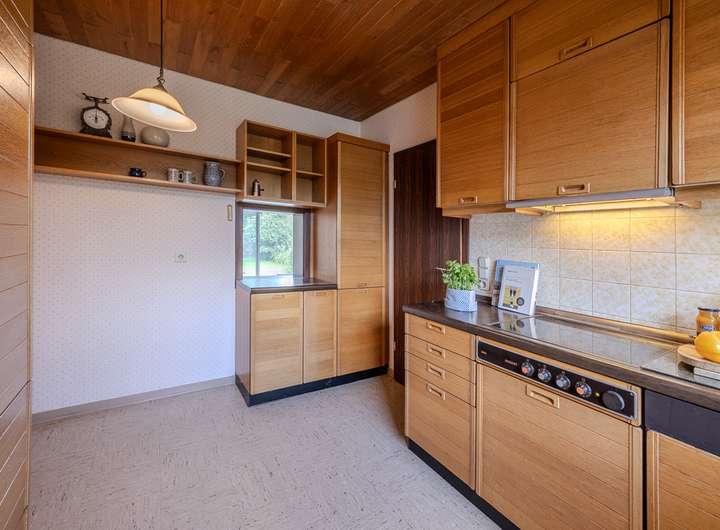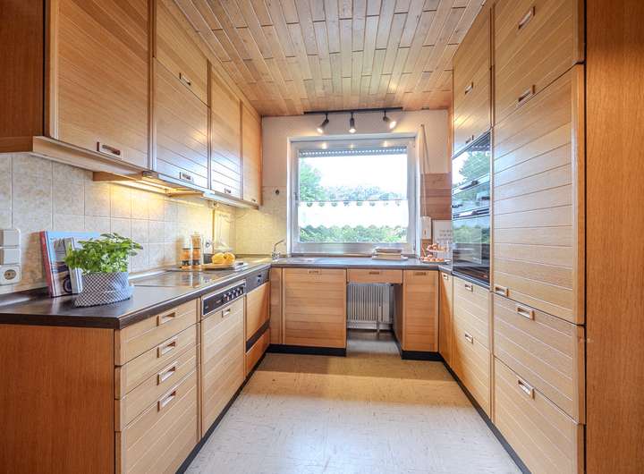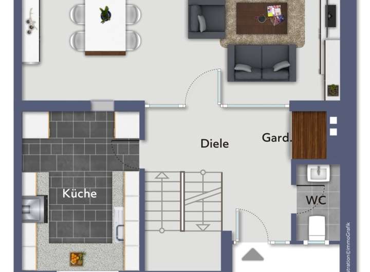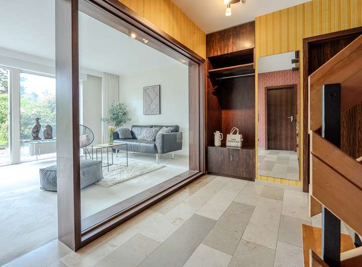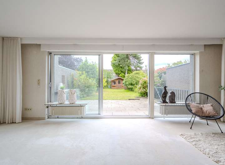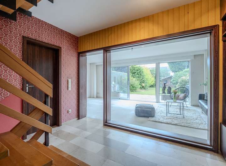Bereits beim Betreten des Hauses spürt man die individuelle Atmosphäre. Die großzügige Diele empfängt Sie mit ausreichend Platz für Garderobe und ersten Stauraum. Direkt angrenzend liegt ein praktisches Gäste-WC. Die Küche ist separat gehalten, mit Blick in den Vorgarten und bietet Platz für einen kleinen Frühstückstisch. Das Wohnzimmer bildet das Herzstück des Hauses: ein sehr heller, freundlicher Raum mit direktem Zugang zur Terrasse und in den grünen Garten. Dieser Bereich eignet sich ideal für entspannte Nachmittage, Grillabende oder einfach ein paar ruhige Stunden im Freien.