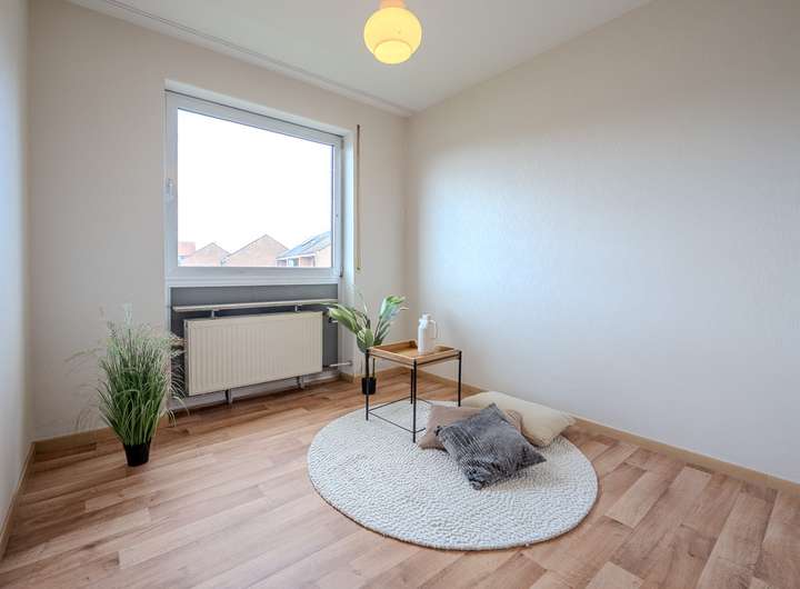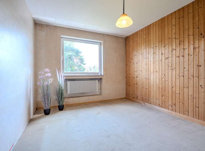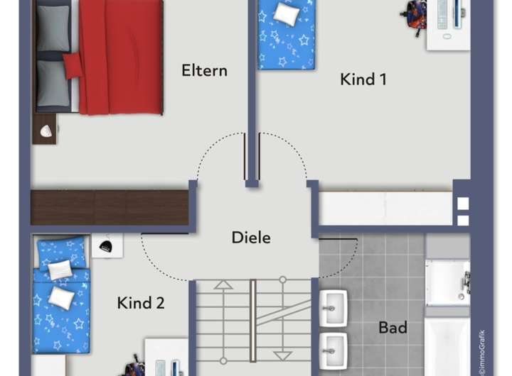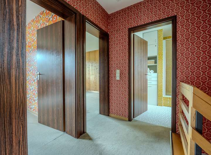 Im Obergeschoss befinden sich drei Schlafzimmer ohne jegliche Dachschrägen, die vielfältige Nutzungsmöglichkeiten bieten – sei es als Kinderzimmer, Arbeitsbereich oder Gästezimmer. Ergänzt wird die Etage durch ein Tageslichtbad, das funktional mit Dusche und Wanne ausgestattet ist und sich als Grundlage für eine moderne Gestaltung anbietet.