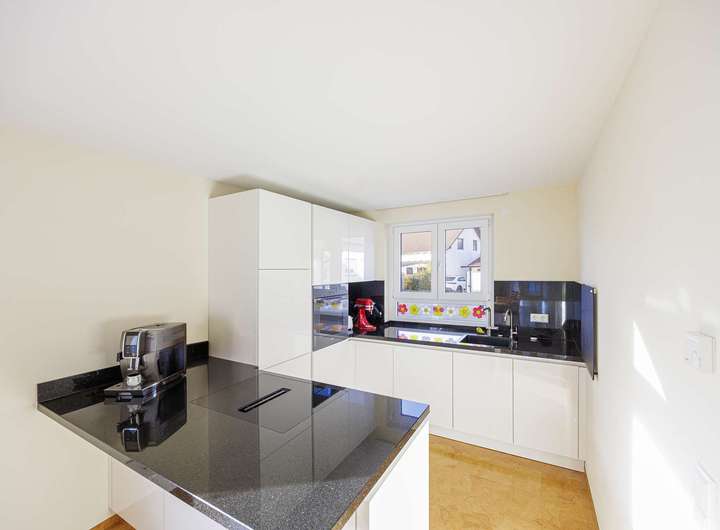 Der Garten, der sich zur Südwestseite erstreckt, lädt zu entspannten Stunden im Freien, zu geselligen Zusammenkünften oder Familienfesten ein und wird so zu einer echten Erweiterung des Wohnraums. Zurück im Wohnzimmer bietet das Wohnzimmer ausreichend Platz für eine einladende Sofalandschaft und ein besonderes Highlight: die integrierte Kinoleinwand – perfekt für einen gemütlichen Filmabend mit der ganzen Familie! Das Wohnzimmer wird ergänzt durch eine offen gestaltete Kochzone mit einer hochwertigen, modernen Einbauküche inklusive Granitarbeitsplatte sowie Elektrogeräten der Marke Siemens. Funktionalität und Design sind hier perfekt vereint, und dank der integrierten Kochinsel wird das gemeinsame Kochen mit Ihren Liebsten zu einem ganz besonderen Erlebnis!