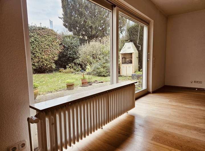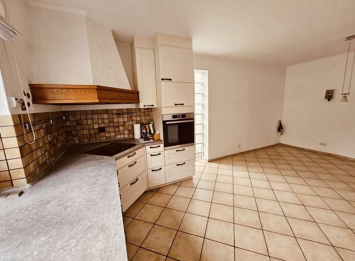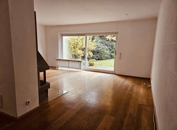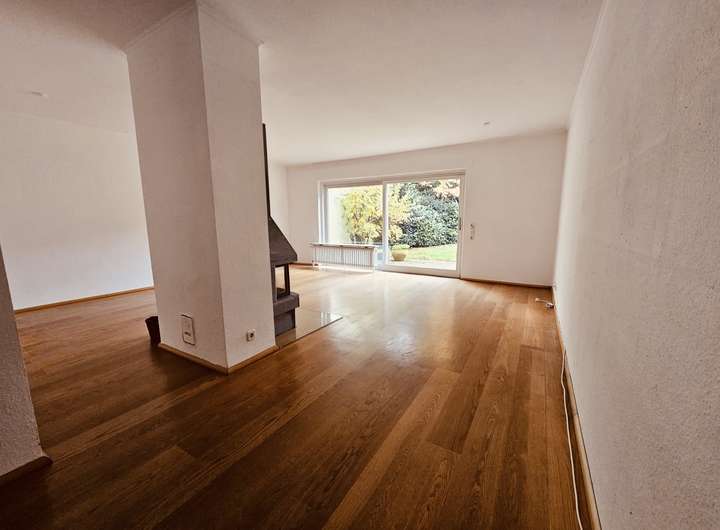Nach dem großzügigen Eingangsbereich öffnet sich die ca. 34 m² große Wohnküche, ausgestattet mit einer modernen Einbauküche und ideal geeignet als zentraler Familien- und Begegnungsort. Ein halbes Stockwerk tiefer befindet sich das gemütliche Wohnzimmer mit Parkettboden, Kamin und direktem Zugang zum gepflegten Garten. Ein fest eingebauter, liebevoll gestalteter Grill macht den Außenbereich zu einem idealen Ort für entspannte Abende und gesellige Runden.