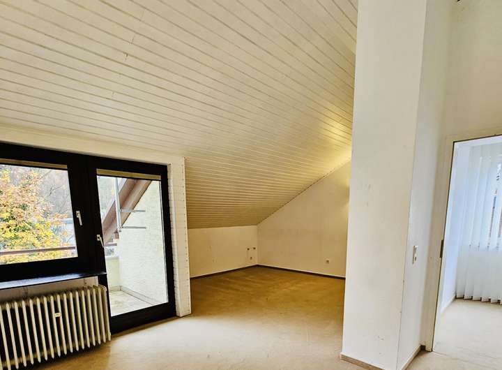 • Im Dachgeschoss bietet ein ca. 25 m² großes Zimmer mit Teppichboden, weißer Holzdecke und eigenem Balkon vielfältige Nutzungsmöglichkeiten – ideal als Rückzugsort, Gästezimmer, Atelier oder Homeoffice.