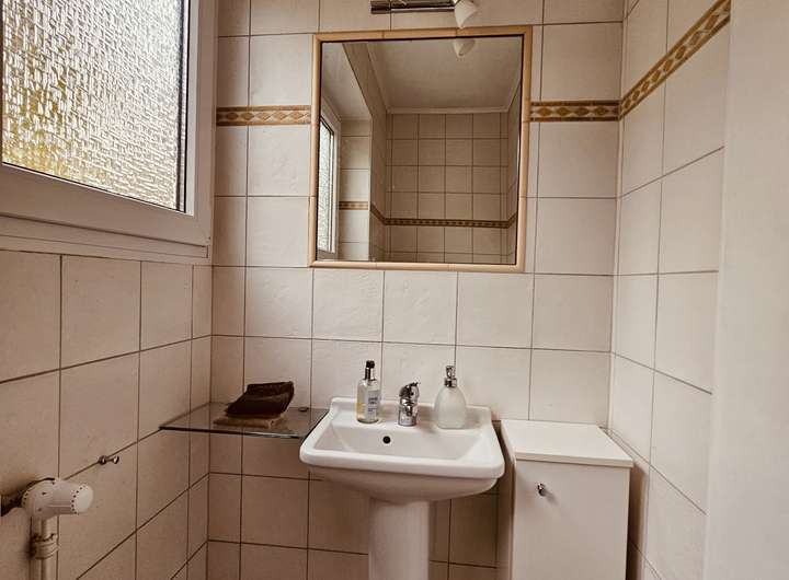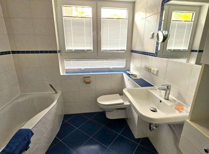 • Eine halbe Ebene darüber befindet sich ein großzügiges weiteres Schlafzimmer mit eingebautem Kleiderschrank auf derselben Ebene wie das Tageslichtbad, das mit Dusche und Badewanne ausgestattet ist.