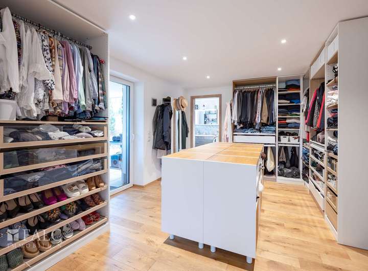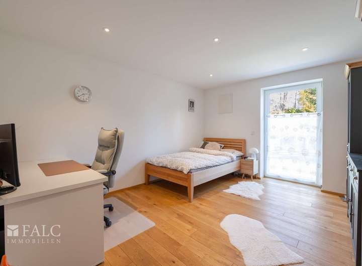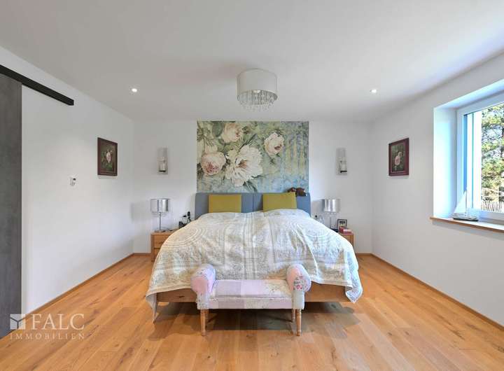 Fünf flexibel nutzbare Zimmer eröffnen vielfältige Gestaltungsmöglichkeiten – ob stilvolles Elternschlafzimmer mit eigenem überdachtem Terrassenzugang, ruhiges Homeoffice oder dem einzigartigen wärmeisolierten Wintergarten. Vor allem das Hauptschlafzimmer beeindruckt durch seine Großzügigkeit und den herrlichen Ausblick in den Garten – ein täglicher Luxus und Genuss, den man nicht mehr missen möchte.