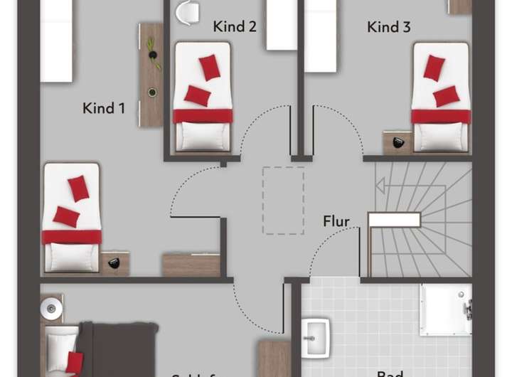 Über eine hochwertige Wendeltreppe gelangt man ins Obergeschoss. Hier befinden sich vier geräumige Zimmer, die flexibel als Schlaf-, Kinder- oder Arbeitszimmer genutzt werden können. Die hellen Räume schaffen eine freundliche und einladende Wohnatmosphäre. Das moderne Hauptbadezimmer ist mit einer Badewanne und einer separaten Dusche ausgestattet und lädt zum Entspannen ein.