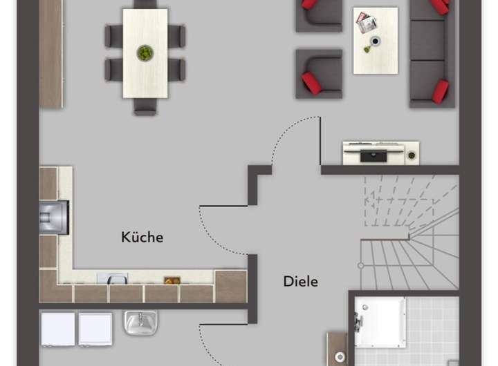 Im Erdgeschoss erwartet Sie ein großzügiger Wohn- und Essbereich mit bodentiefen Fenstern, die für viel Tageslicht und ein angenehmes Raumgefühl sorgen. Die moderne Einbauküche ist mit Markengeräten von Bosch und Siemens ausgestattet und fügt sich harmonisch in das Wohnkonzept ein. Ein Gäste-WC mit Dusche ergänzt das Raumangebot auf dieser Etage. Der Hauswirtschaftsraum bietet neben Anschlüssen für Waschmaschine und Trockner auch ein eigenes Waschbecken.