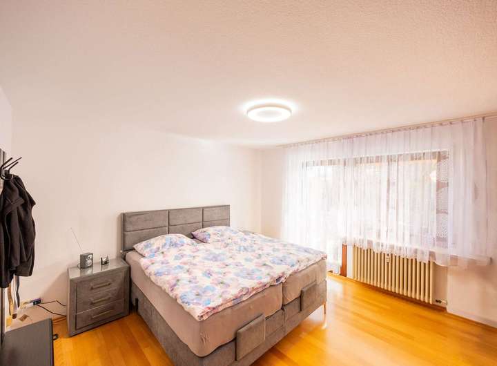 Zurück im Flur führt der Weg nach links zu weiteren Wohnräumen. Auf der rechten Seite befindet sich ein liebevoll gestaltetes Kinderzimmer, das sich ebenso gut als Gäste- oder Arbeitszimmer eignet. Linker Hand liegen ein separates WC sowie ein stilvoll ausgestattetes Badezimmer mit Badewanne und Dusche. Am Ende des Flurs wartet das großzügige Hauptschlafzimmer, das mit einem eigenen Zugang zur Terrasse überzeugt, ideal um den Tag mit dem ersten Sonnenstrahl zu beginnen oder den Abend mit Blick in die Natur ausklingen zu lassen. Geradeaus schließt ein weiteres Kinderzimmer den Grundriss harmonisch ab.