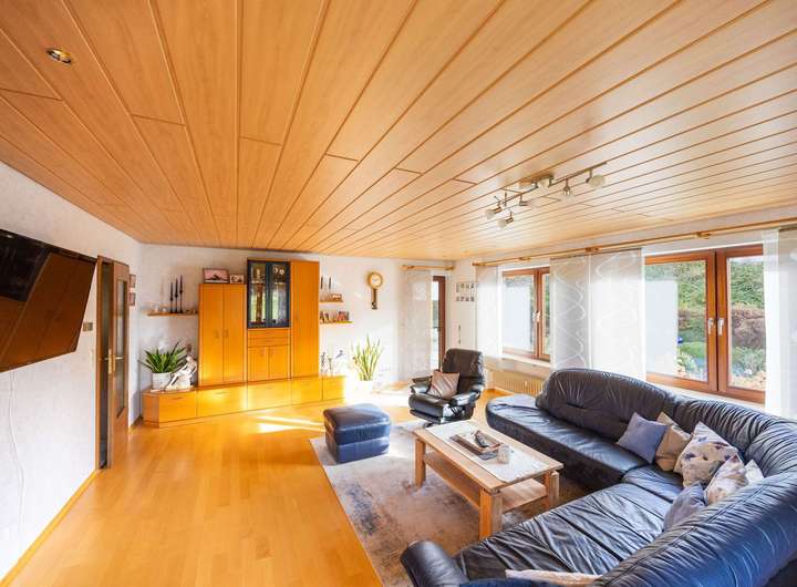 Gegenüber des Esszimmers befindet sich das großzügige Wohnzimmer, das mit seiner hellen, freundlichen Atmosphäre und großen Fensterfronten begeistert. Von hier aus gelangt man auf die sonnige Terrasse und in den weitläufigen Garten, der mit seiner grünen Kulisse eine Oase der Entspannung bildet, perfekt für Familienfeste, gemütliche Sommerabende oder einfach zum Durchatmen.