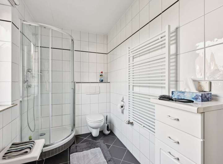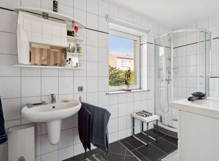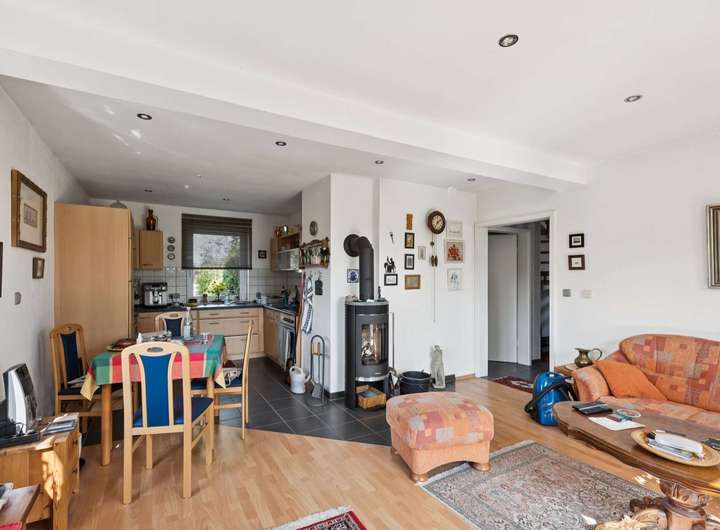 Im Erdgeschoss befinden sich ein großes und helles Wohn- und Esszimmer mit schönem Kaminofen und Zugang zur Terrasse, eine zum Wohnzimmer offene Küche mit hochwertiger Einbauküche und Markengeräten, ein Schlafzimmer, ein Hausanschlussraum mit der Heiztechnik, ein Duschbad sowie eine Diele. Von der Diele gelangt man über eine Treppe in das Dachgeschoss.
