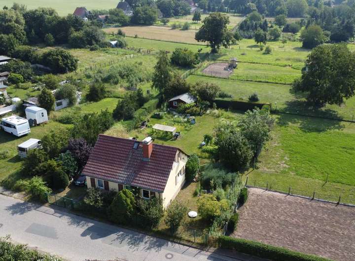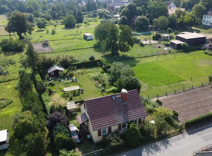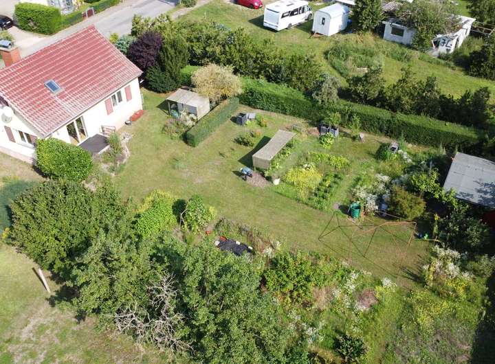 Auf dem sonnigen und idyllisch angelegten Gartengrundstück befinden sich noch ein Holzschuppen.