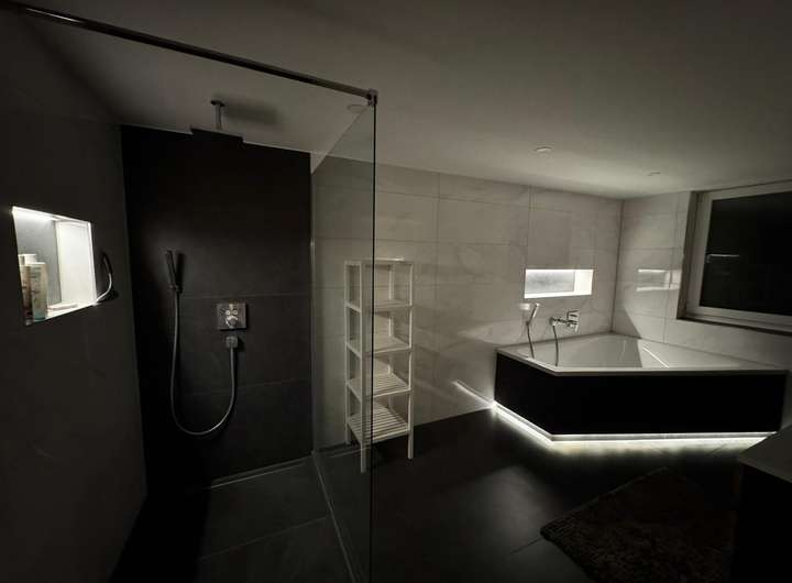 Modernes Badezimmer mit begehbarer Dusche, Fußbodenheizung
