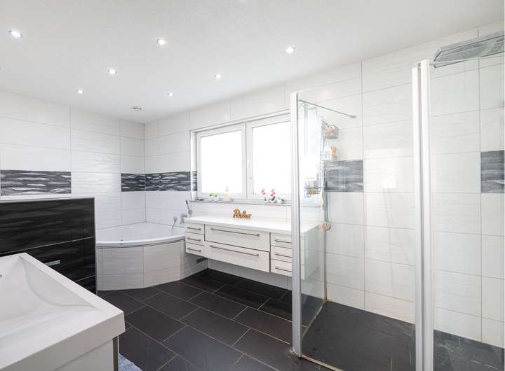 Diese moderne Stadtvilla mit klassischem Walmdach verbindet repräsentatives Design mit durchdachter Raumplanung. Im Jahr 2015 wurde die Immobilie auf einem Eckgrundstück in einem ruhigen Wohngebiet in massiver Bauweise errichtet. Das junge Baujahr und die hochwertige Ausstattung machen die Liegenschaft zu einem idealen Zuhause für Familien und alle, die Wert auf Komfort und viel Platz legen. Im Erdgeschoss öffnet sich ein lichtdurchfluteter, offener Wohn- und Essbereich mit integrierter Küche. Der zentrale Küchenblock der weißen Hochglanzküche wird schnell zum Treffpunkt für gemeinsames Kochen und gesellige Abende für Familie und Freunde. Gleich nebenan sorgt die praktische Speisekammer für Ordnung und kurze Wege. Ein Gäste-WC und ein flexibles Zimmer – ideal für Ihr Homeoffice oder spontane Übernachtungsgäste – ergänzen den komfortablen Grundriss. Ein Kaminofen schafft behagliche Wärme, die sich im ganzen Haus verbreitet. Das Obergeschoss ist der persönliche Rückzugsort: Drei große Schlafzimmer bieten Platz für Ruhe und Entfaltung. Das elegante Masterbad mit Wanne und Dusche wird zu Ihrer privaten Wellness-Oase. Die offene Galerie verleiht ein besonders mondänes Raumgefühl und unterstreicht den Charakter des Hauses. Im Untergeschoss finden sich neben den klassischen Versorgungsräumen zwei weitere, flexibel nutzbare Zimmer mit eigenem Eingang – ideal als Gästebereich, Homeoffice oder Hobbys. Die Anschlüsse für eine Sauna lassen Raum für Ihre individuellen Wellness-Ideen. Zur Ausstattung gehören elektrische Jalousien, allergikerfreundliche Feinsteinzeugböden sowie eine moderne Wärmepumpe, die für ein zeitgemäßes und energieeffizientes Heizen steht. In zwei Garagen findet der gesamte Fuhrpark Platz. Der sonnige Garten rundet das Gesamtbild ab und lädt zu entspannten Stunden im Freien ein – ein Refugium für alle, die modernes Wohnen mit Stil und Lebensqualität verbinden möchten.