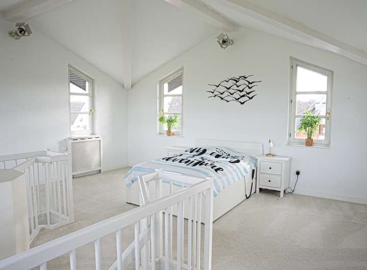 Ein besonderes gestalterisches Element ist ein turmartig ausgeführter Wohnraum mit weitem Ausblick. Zusätzlich verfügt das Anwesen über einen integrierten Sicherheitsraum und ein modernes Alarmsystem. Für zusätzlichen Komfort im Alltag sorgt ein privater Wellnessbereich mit Schwimmbad und Sauna.