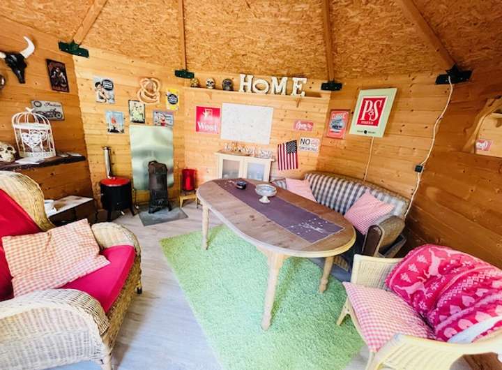 - Gartenpavillion (ca. 12 m²) mit Kaminofen, überdachter Sitzecke und Feuerstelle