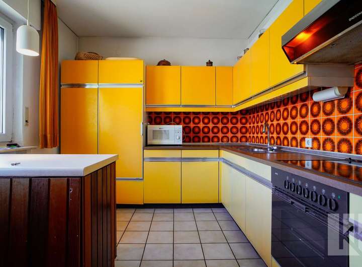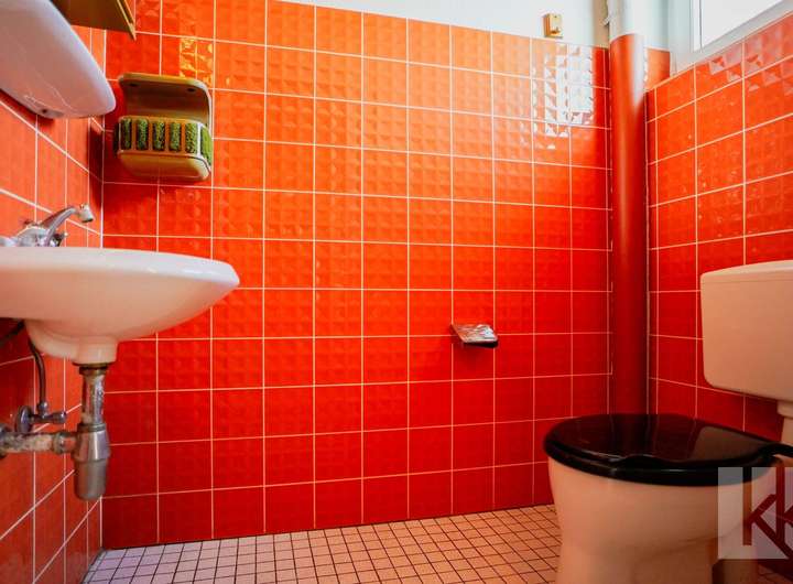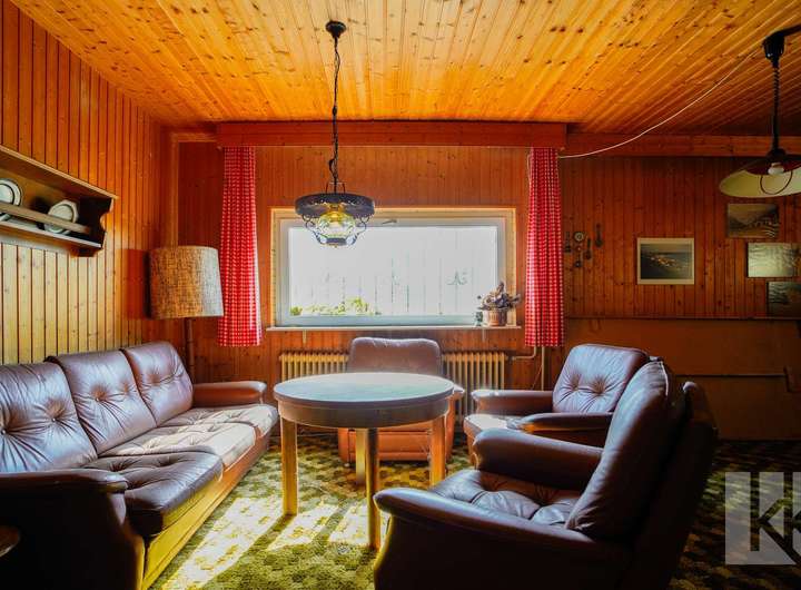Schon beim Betreten des Hauses empfängt Sie ein kleiner Windfang mit Gäste-WC – praktisch und einladend. Dahinter öffnet sich eine geräumige Küche mit nostalgisch anmutender Einbauküche, die echten Retro-Charme versprüht. Der anschließende Wohnbereich mit Zugang zur Terrasse bildet das Herzstück des Hauses: Hell, gemütlich und mit Blick in den großzügigen Garten, der zu entspannten Stunden im Freien einlädt.