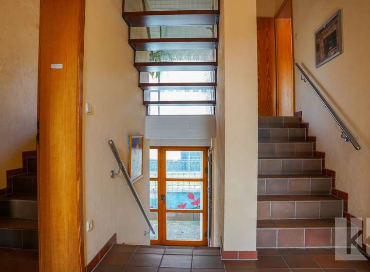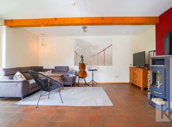 Der Eingangsbereich bietet Platz für eine Garderobe und führt zentral in alle Ebenen des Hauses. Auf der linken Seite gelangen Sie in den Wohn- und Essbereich, wo ein Kaminofen für behagliche Wärme sorgt. Große Fensterflächen lassen viel Tageslicht herein und öffnen den Zugang zur Terrasse.