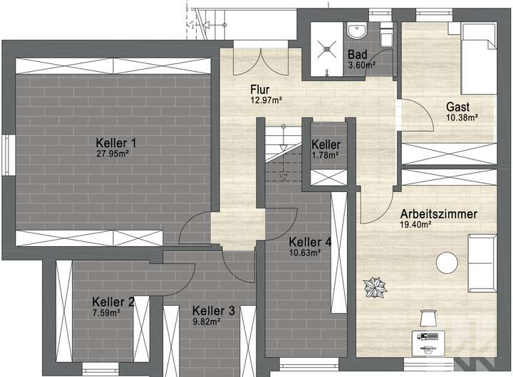 Der Keller ist ebenfalls auf zwei Ebenen aufgeteilt: Der obere Bereich bietet einen wohnlich ausgebauten Teil mit Bad und zwei hellen, flexibel nutzbaren Räumen, ehemals gewerblich genutzt. Im unteren Bereich befinden sich Hausanschlüsse, Werkstatt und Lagerräume.