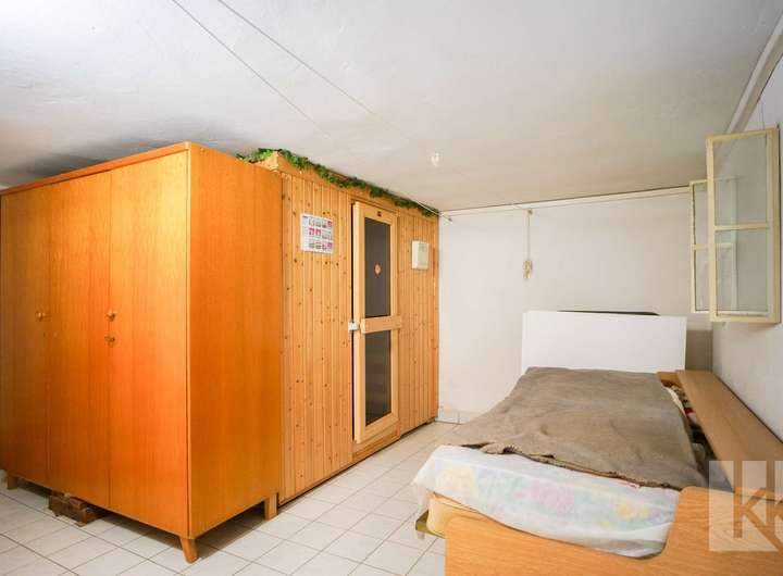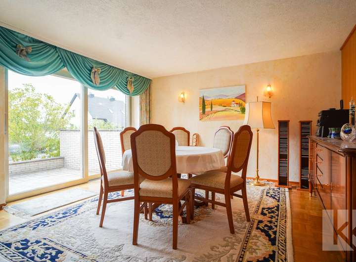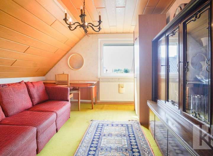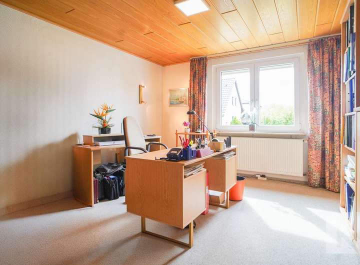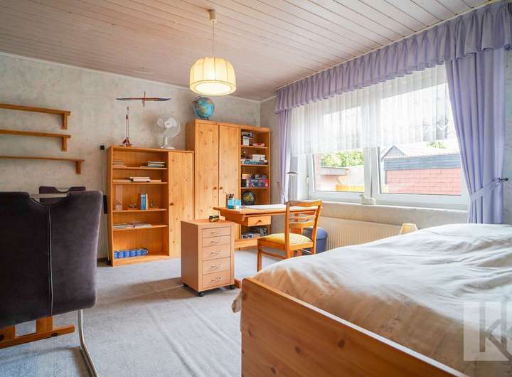 Im Erdgeschoss bildet das helle Wohn- und Esszimmer den Mittelpunkt, der Essbereich wurde in den 70er-Jahren angebaut und mit Parkett ausgestattet. Nebenan liegen ein Schlafzimmer oder Gästezimmer, die Küche mit angrenzendem Wintergarten von etwa 15 m² sowie ein Badezimmer mit Dusche und Wanne. Über den Anbau von 1992 erreicht man ein großes Schlafzimmer, das vielfältige Gestaltungsmöglichkeiten offenlässt, da in der Wand Wasseranschlüsse vorhanden sind. Zudem befindet sich hier ein weiteres Kinderzimmer.