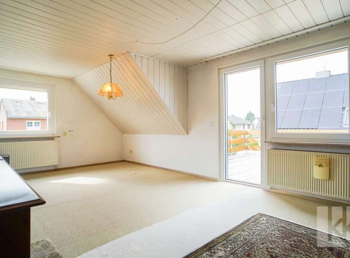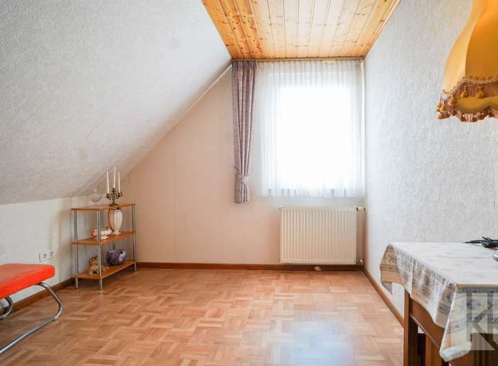 Im Obergeschoss stehen ein Badezimmer mit Dusche und Wanne, ein Schlafzimmer, ein Kinderzimmer sowie ein großes Wohnzimmer mit Balkon zur Verfügung, sodass hier problemlos eine zweite Wohnung eingerichtet werden kann.