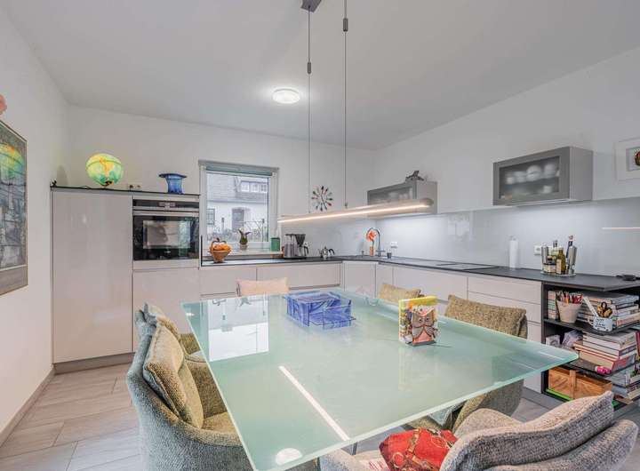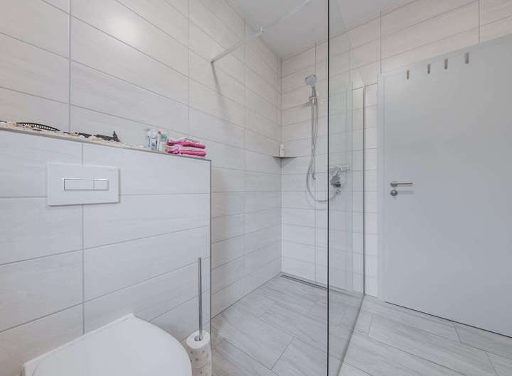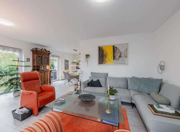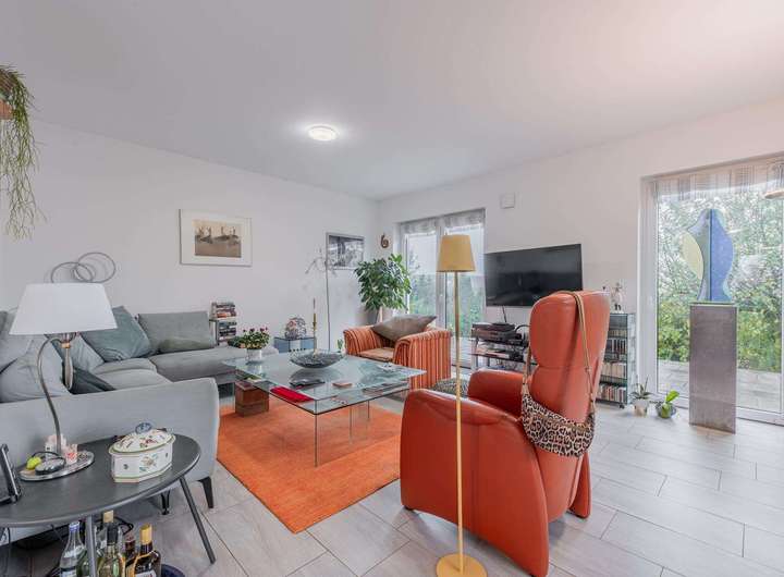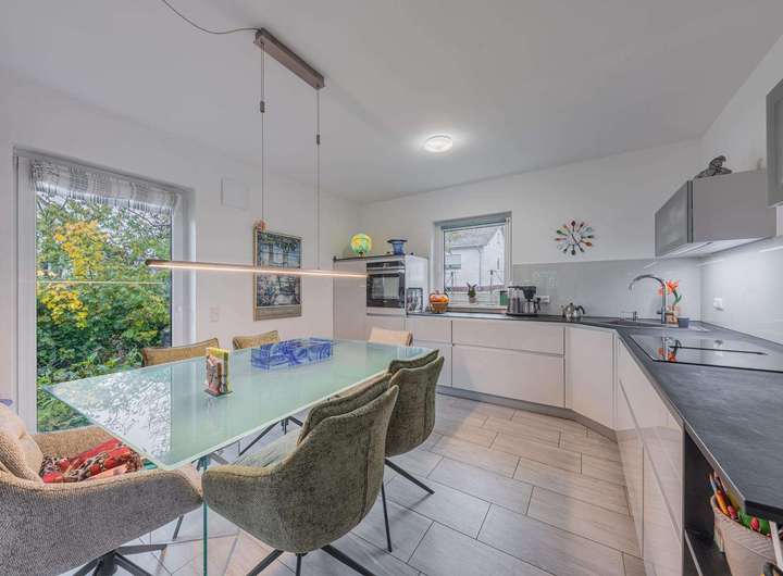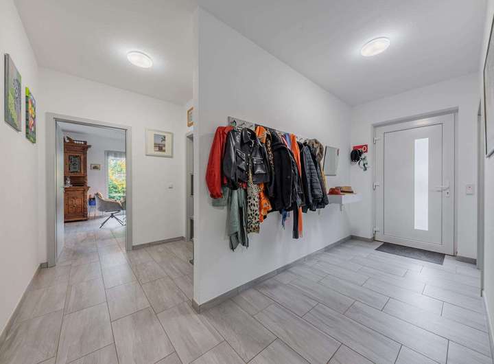 Alle Wohnräume sind einheitlich mit pflegeleichten Bodenfliesen ausgestattet. Die Fenster besitzen eine Dreifachverglasung und Rollläden, teilweise elektrisch bedienbar. Zwei zeitgemäß ausgestattete Badezimmer stehen zur Verfügung: ein separates Duschbad sowie ein weiteres Bad mit Wanne und bodengleicher Dusche. Für ein konstantes und gesundes Raumklima sorgt das Lüftungssystem von LUNOS.
