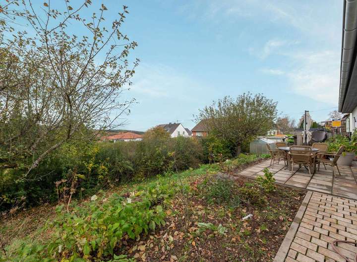 Der nutzbare Außenbereich konzentriert sich auf die geschützte Terrasse hinter dem Haus, die einen angenehmen Platz zum Sitzen, Essen und Entspannen bietet. Der vordere Grundstücksteil übernimmt die Funktion eines klassischen Vorgartens und schafft eine angenehme Distanz zur Straße. Hinter dem Gebäude fällt das Gelände durch die Geländemodellierung steiler ab, wodurch dieser Bereich weitgehend pflegeleicht bleibt und nur wenig Betreuung erfordert.